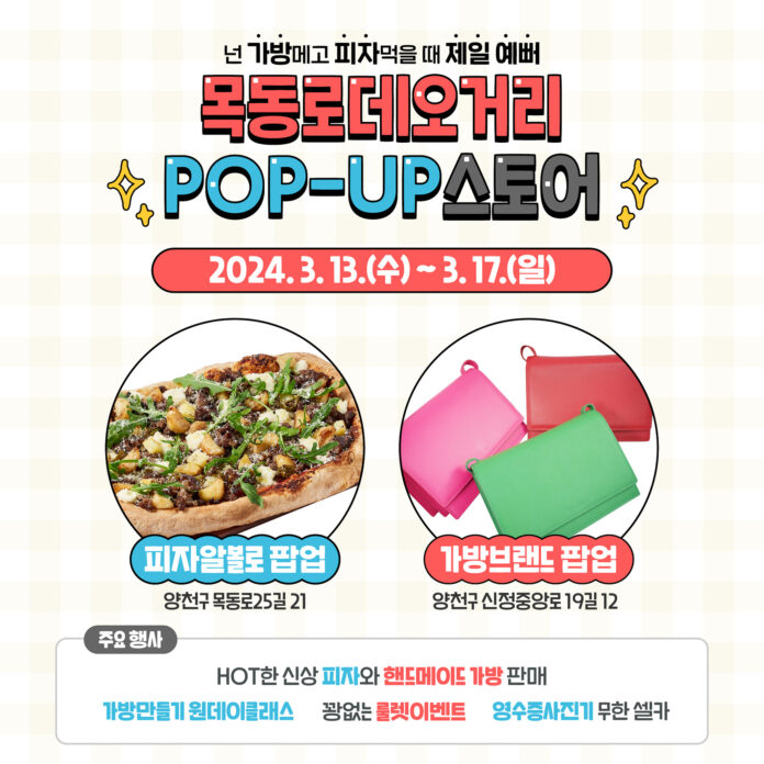 양천구(구청장 이기재)는 3월 13일부터 17일까지 5일간 목동역 인근 목동로데오거리 공실 점포 두 곳을 활용해 피자와 가방을 주제로 로컬브랜드가 참여하는 ‘체험형 팝업스토어’를 개장한다고 밝혔다.