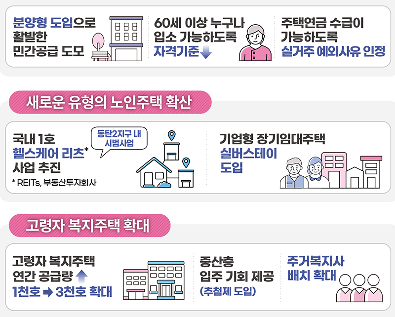 정부는 분양형 주택 재도입, 입주자격 및 위탁운영 등 관련 제도 개선을 통해 실버타운(노인복지주택) 활성화를 추진한다.