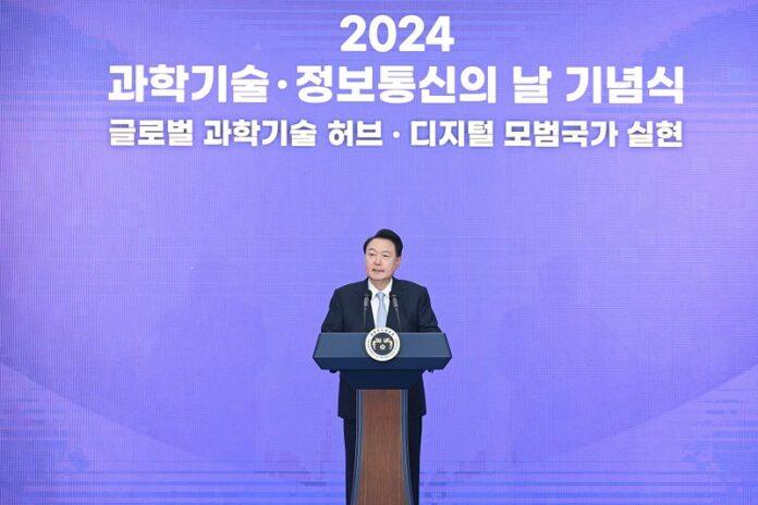 윤 대통령은 이날 오후 경기도 과천 국립과천과학관에서 열린 ‘2024년 과학기술·정보통신의 날’기념사에서 “전 세계는 기술주권 확보와 미래 시장 주도를 위해 ‘총성 없는 전쟁’을 벌이고 있다”며 이 같이 말했다.