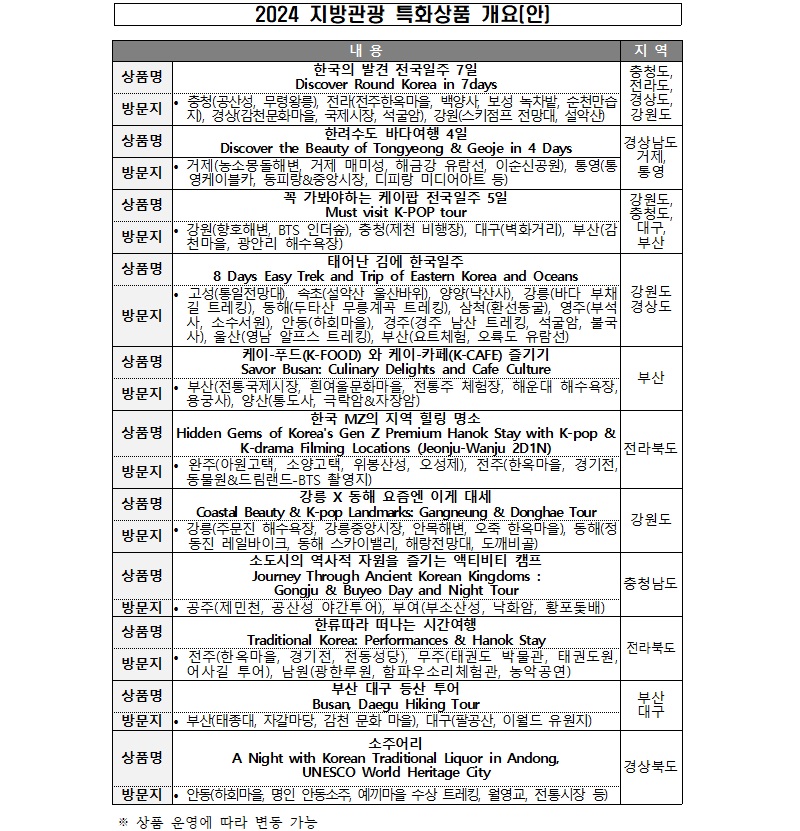 문체부와 방문위는 ‘2024 한국방문의 해’를 계기로 외국인 관광객의 지역 방문을 확산하기 위해 새롭게 지방관광 특화상품 개발 사업을 추진했다.